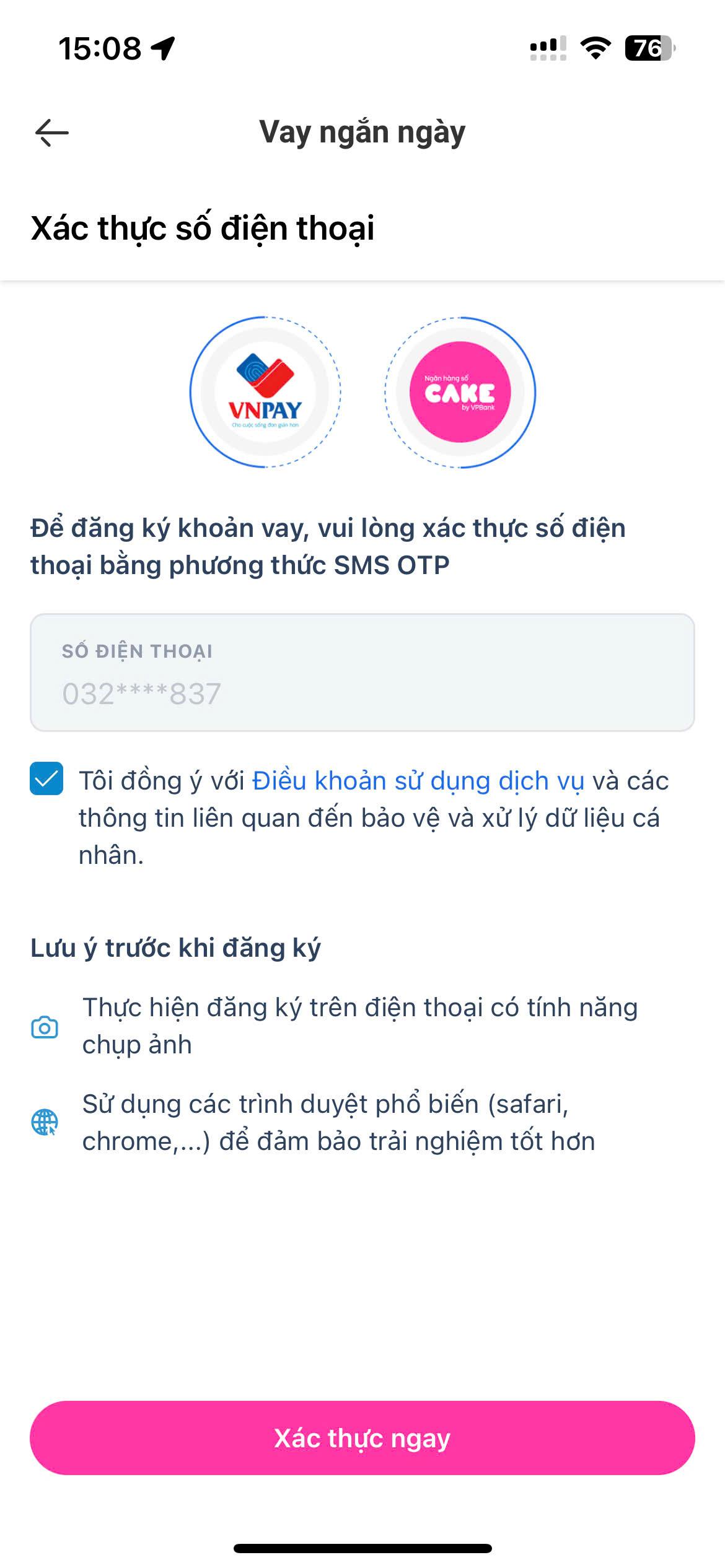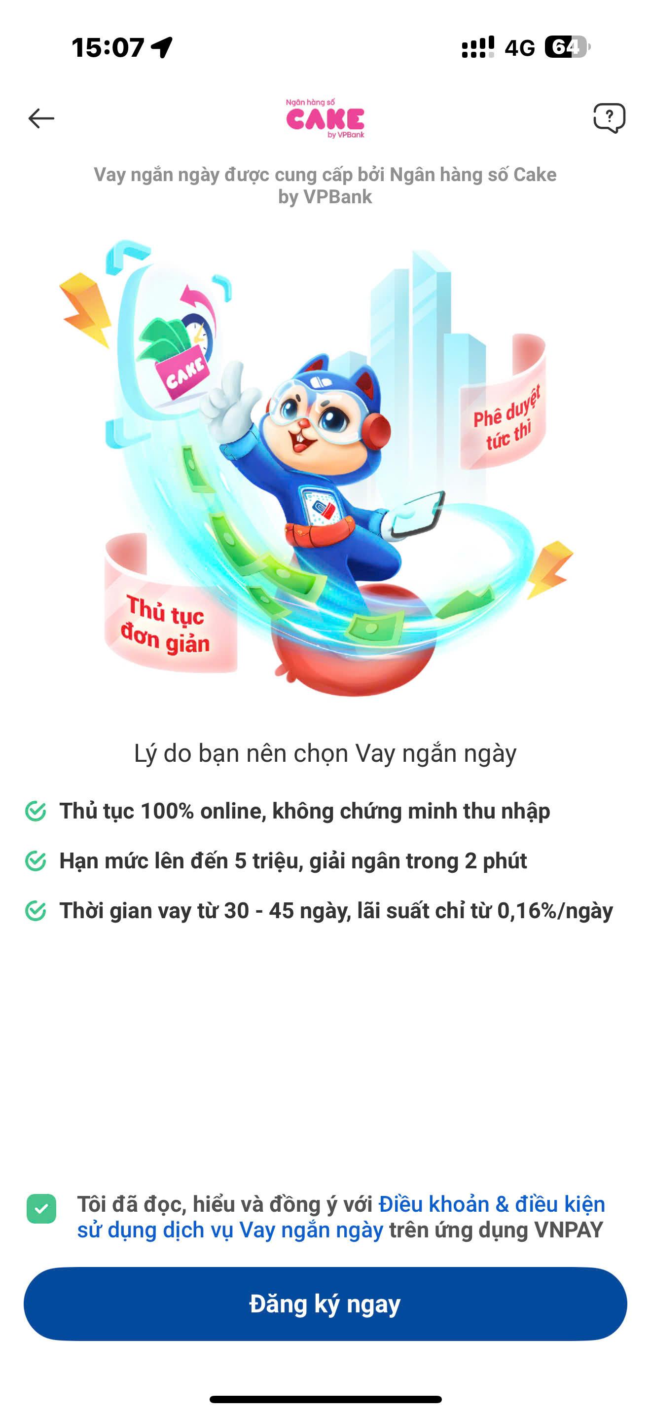 Đọc kỹ Điều khoản, điều kiện sử dụng dịch vụ Vay ngắn ngày trên ứng dụng VNPAY, nhấn Đăng ký ngay