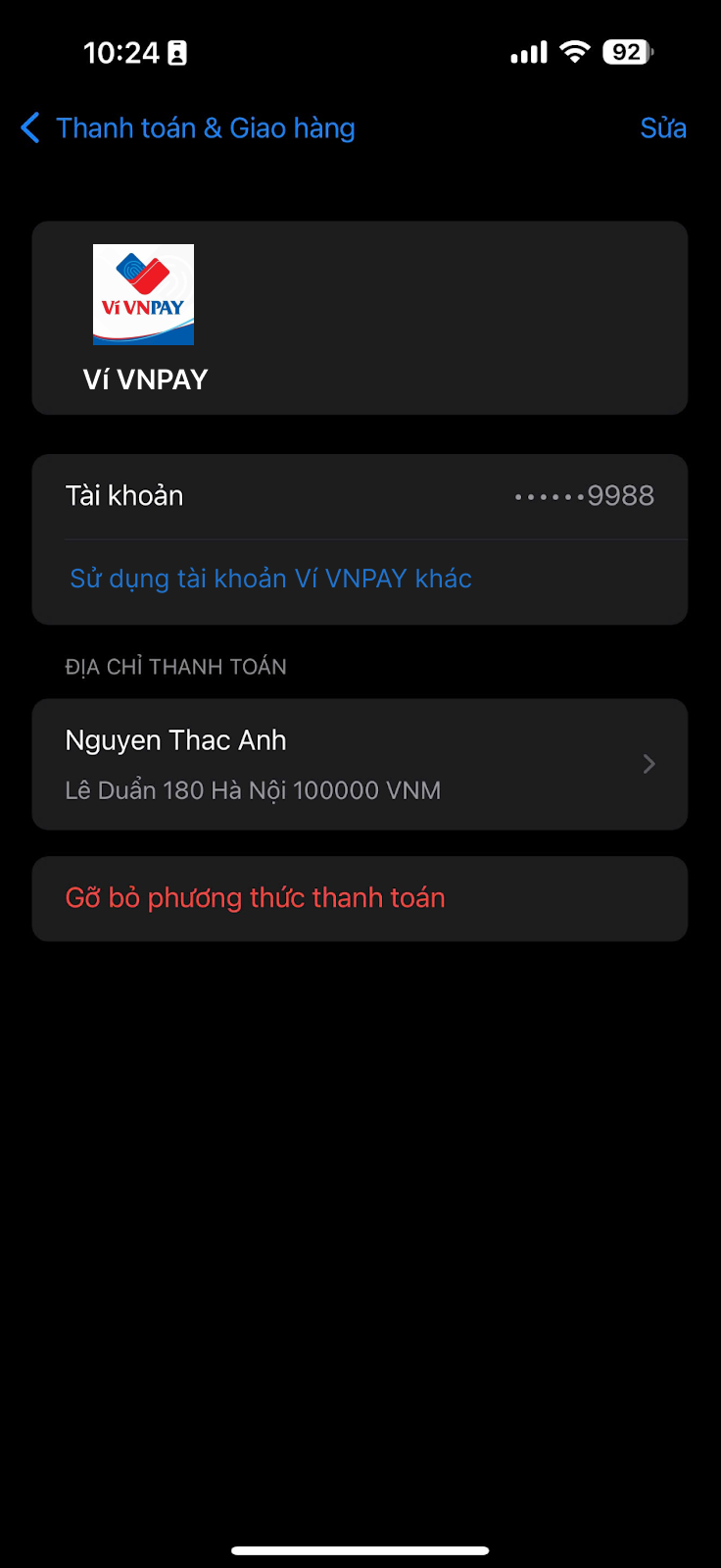 Bước 4: Trong phần xem chi tiết, KH có các tùy chọn bấm “Sửa” để sửa thông tin KH, hoặc bấm “Gỡ phương thức thanh toán” để gỡ bỏ phương thức thanh toán.