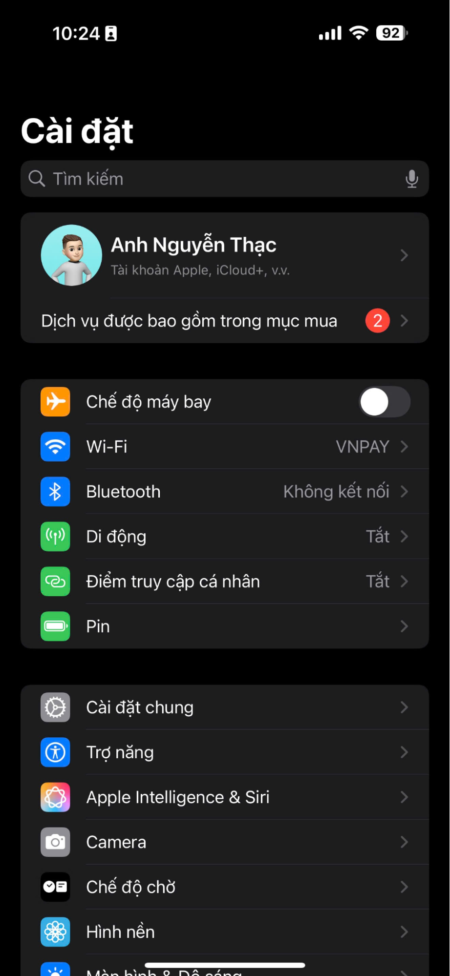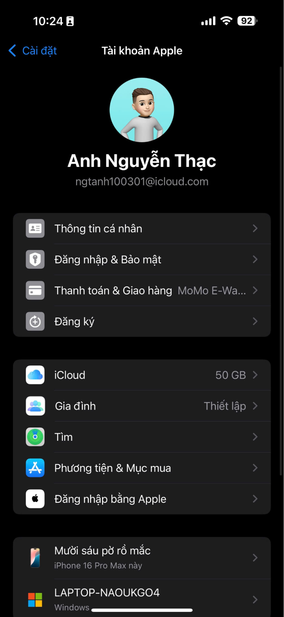 Bước 1: Khách hàng vào ứng dụng “Cài đặt”, chọn “ID Apple” (Phần tên người dùng), xác thực bằng Face ID hoặc mật khẩu để truy cập.